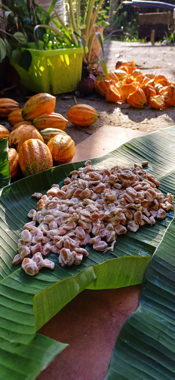 Ces fèves sont disposées dans des caisses recouvertes bien souvent de feuilles de bananier afin que l’arôme très caractéristique du cacao puisse se développer, mais aussi pour se débarrasser définitivement des restes de pulpe. Cette fermentation prend entre 5 à 7 jours.